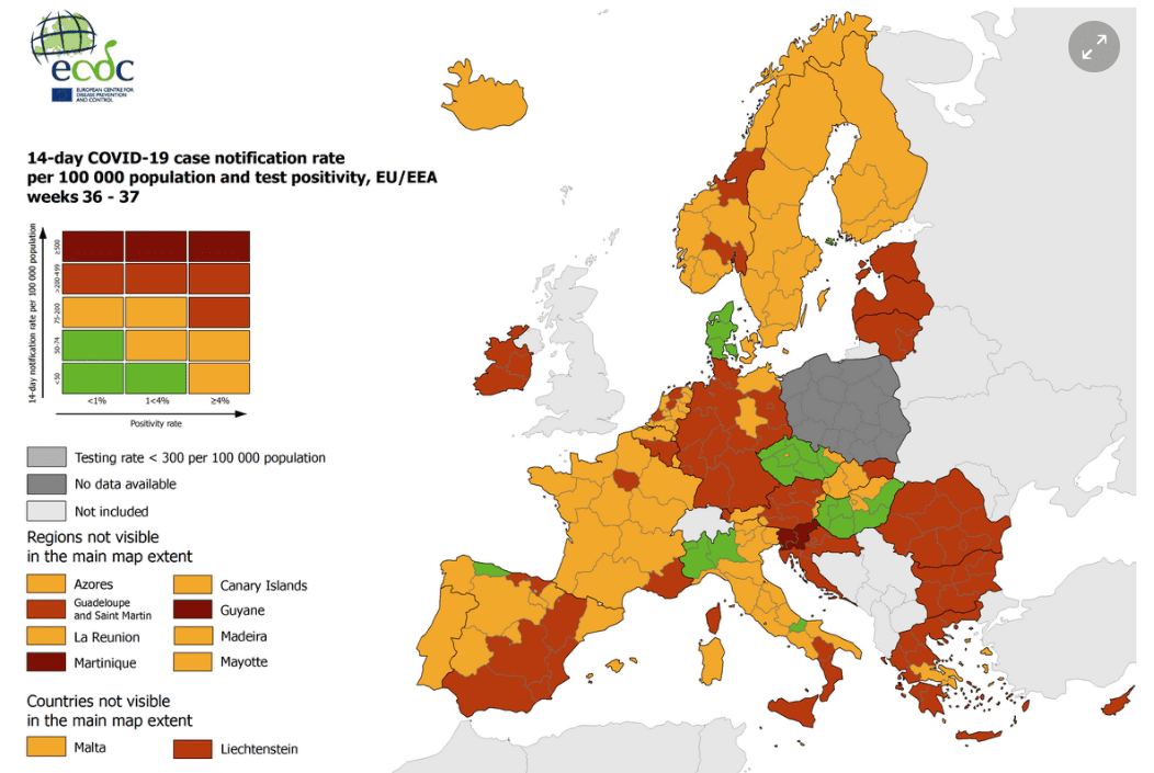 Dok je cijelo ljeto Hrvatska pokazivala izuzetno dobre brojke, te se držala u "zelenoj", a potom i "narančastoj" zoni, jug francuske, Španjolska i Italija su pokazivale najveće brojke zaraženih. Situacija se mijenja, te su brojke u ovim dijelovima Europe polagano u padu.