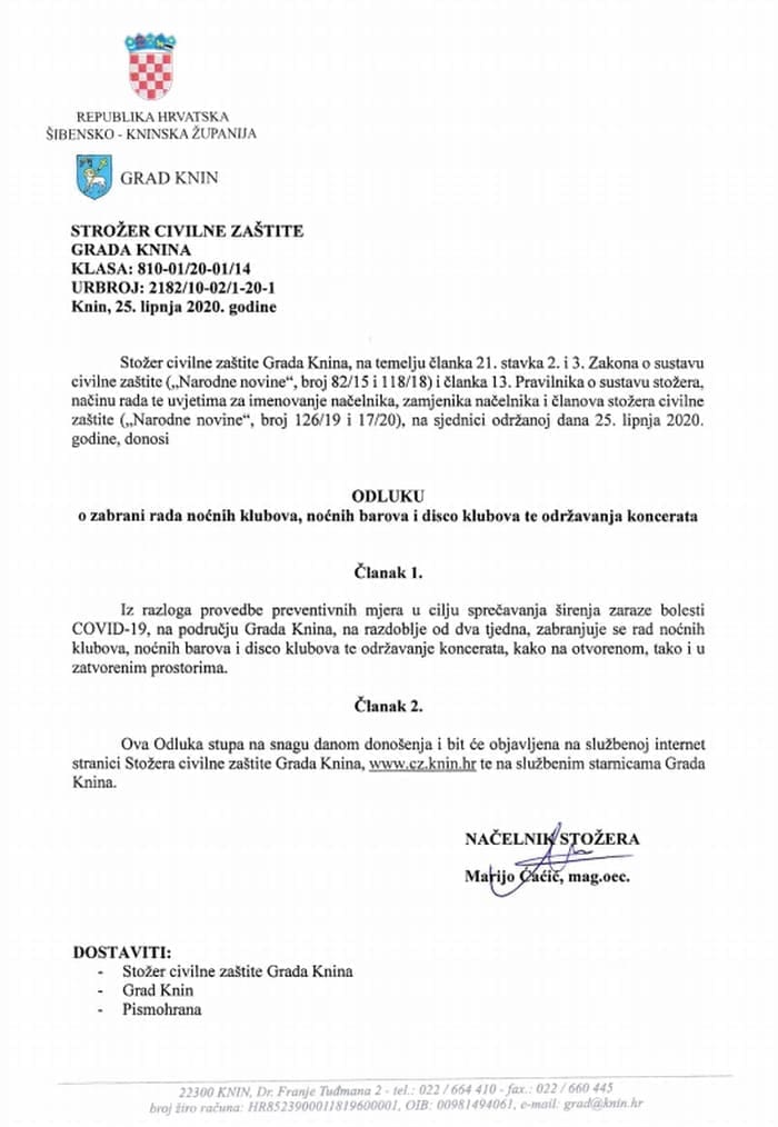 Naime, na stranicama županijskog Stožera objavljeno je kako je Grad Knin donio Odluku o zabrani rada noćnih klubova, noćnih barova i disco klubova te održavanja koncerata u zatvorenim i otvorenim prostorima na razdoblje od dva tjedna.