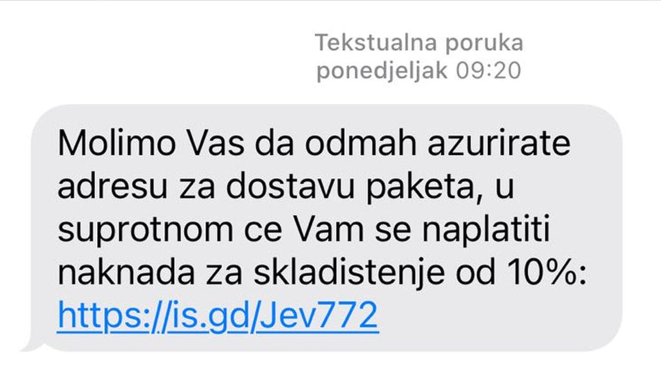 Građani sve češće primaju SMS poruke od nepoznatih brojeva, u kojima ih se traži da „odmah ažuriraju adresu za dostavu paketa“ kako im se ne bi naplatila naknada za skladištenje. U porukama se nalazi i poveznica na koju korisnici trebaju kliknuti, no riječ je o očitoj prijevari.
