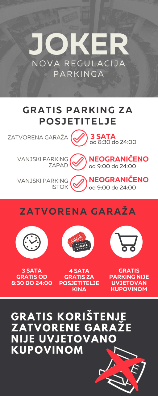 Zatvorena garaža Jokera prema novoj regulaciji radi od 0-24. Parkiranje u garaži također je besplatno u trajanju do tri sata u terminima radnog vremena centra, točnije od 8:30 do ponoć.