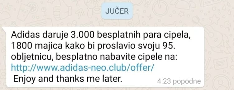 "Adidas daruje 3.000 besplatnih para cipela, 1800 majica kako bi proslavio svoju 95. obljetnicu", stoji u poruci u nastavku koje je lažna Adidas stranica, što se odmah može vidjeti iz domene.
