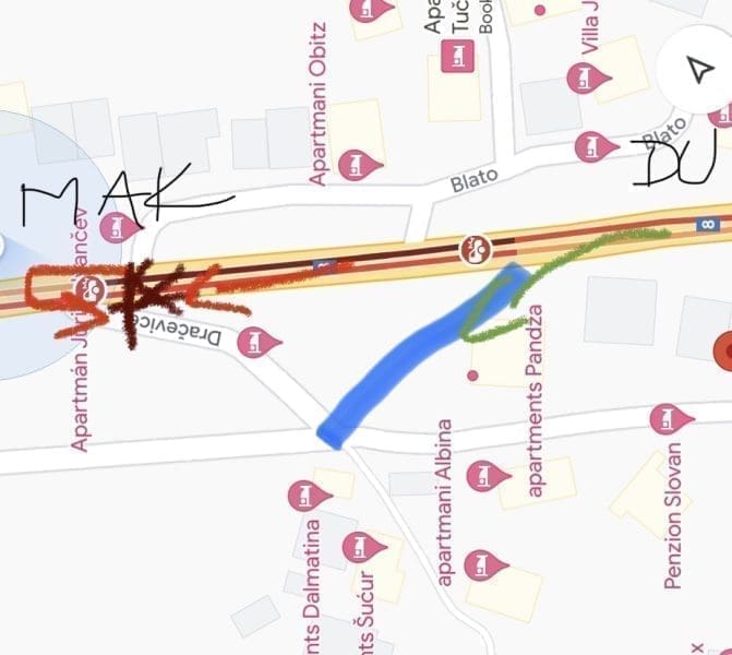 - Kao što vidite, na Google maps, a vjerojatno i drugim navigacijskim sustavima, cesta koja bi osigurala sigurniji promet nije opće označena (plava linija). O prometnim znakovima da i ne govorim, nema apsolutno nijednog prometnog znaka koji bi regulirao promet pri tom skretanju, ni iz smjera Makarske, ni iz smjera Dubrovnika (iako su mi neki susjedi rekli da postoji, ja koji cijeli život tu živim, nisam ga vidio, kako će onda turisti), ni iz smjera hotela (još veći se problem javlja kad turisti iz tog smjera skreću za Podgoru). Ljeti se zbog ovog stvaraju ogromne gužve. A da sve još bude bolje, na cesti označenoj Dračevice postoji nogostup, ali preko magistrale nema pješačkog prijelaza kako bi se taj nogostup koristio, što stvara opasnost za pješake - poručuje nezadovoljni mještanin.