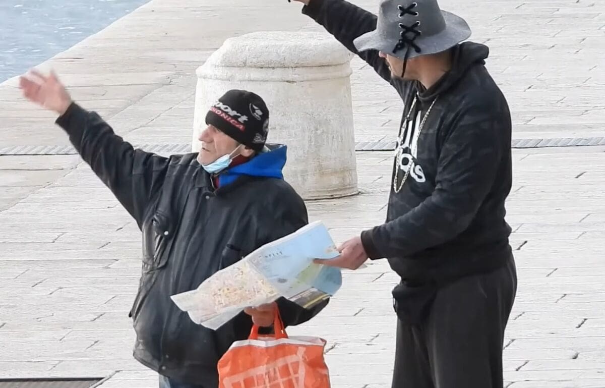 On s kartom Splita u ruci prolaznike moli da mu pojasne kako do Visoke ili Smrdečca. Zaustavljao je mahom starije prolaznike koji ne razumiju engleski ili ga teško govore.