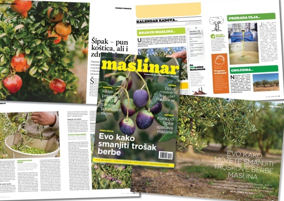 U novom broju časopisa Maslinar doznajte kako smanjiti trošak berbe; kako precizno utvrditi zarazu paunovim okom; kako kora od šipka može spasiti masline; može li od dobrih maslina nastati loše ulje i još mnogo toga!