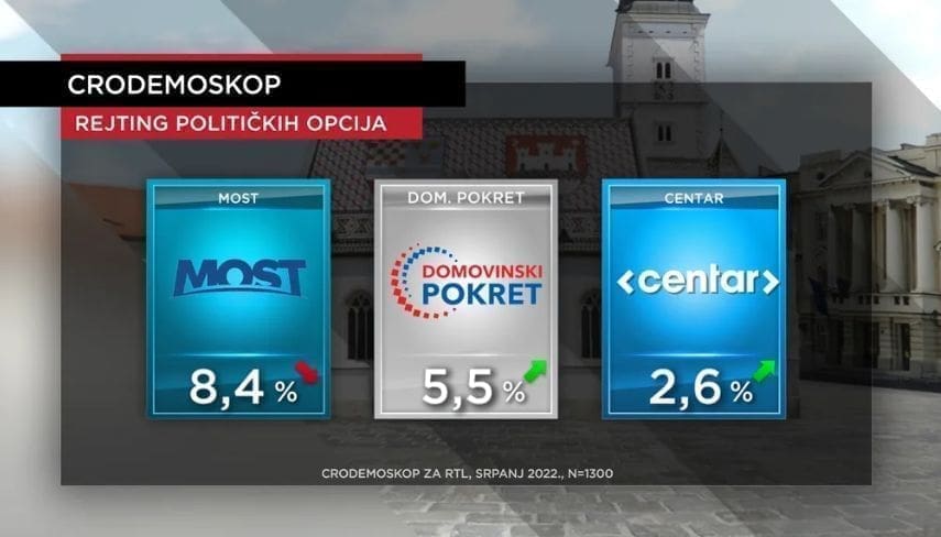 S trendom pada bori se i MOST (srpanj 8,4 posto - lipanj 9,2 posto), za razliku od Domovinskog pokreta (srpanj 5,5 posto - lipanj 5,1 posto) i CENTRA (srpanj 2,6 posto - lipanj 2,0 posto) koji su pak u blagom rastu.