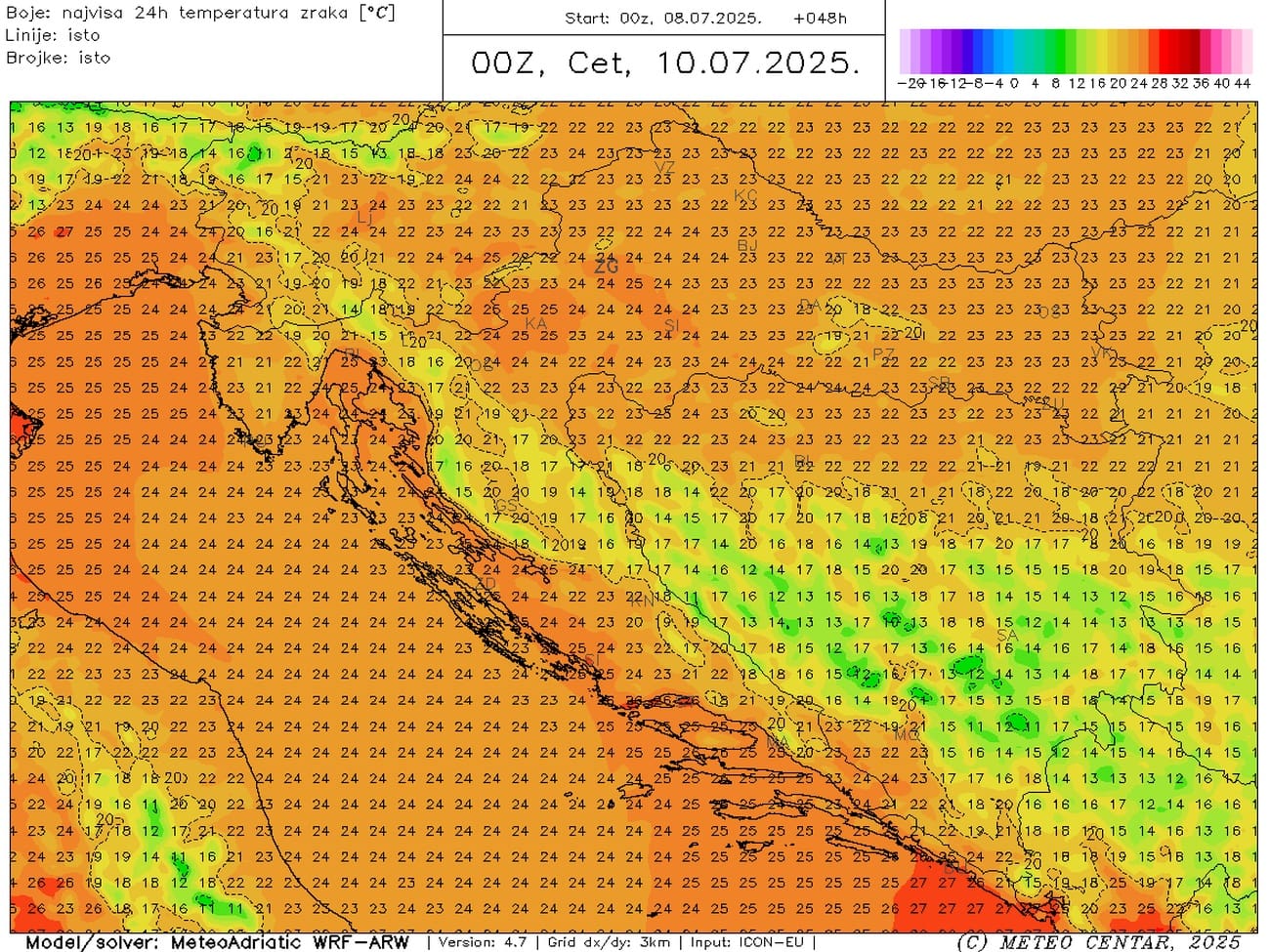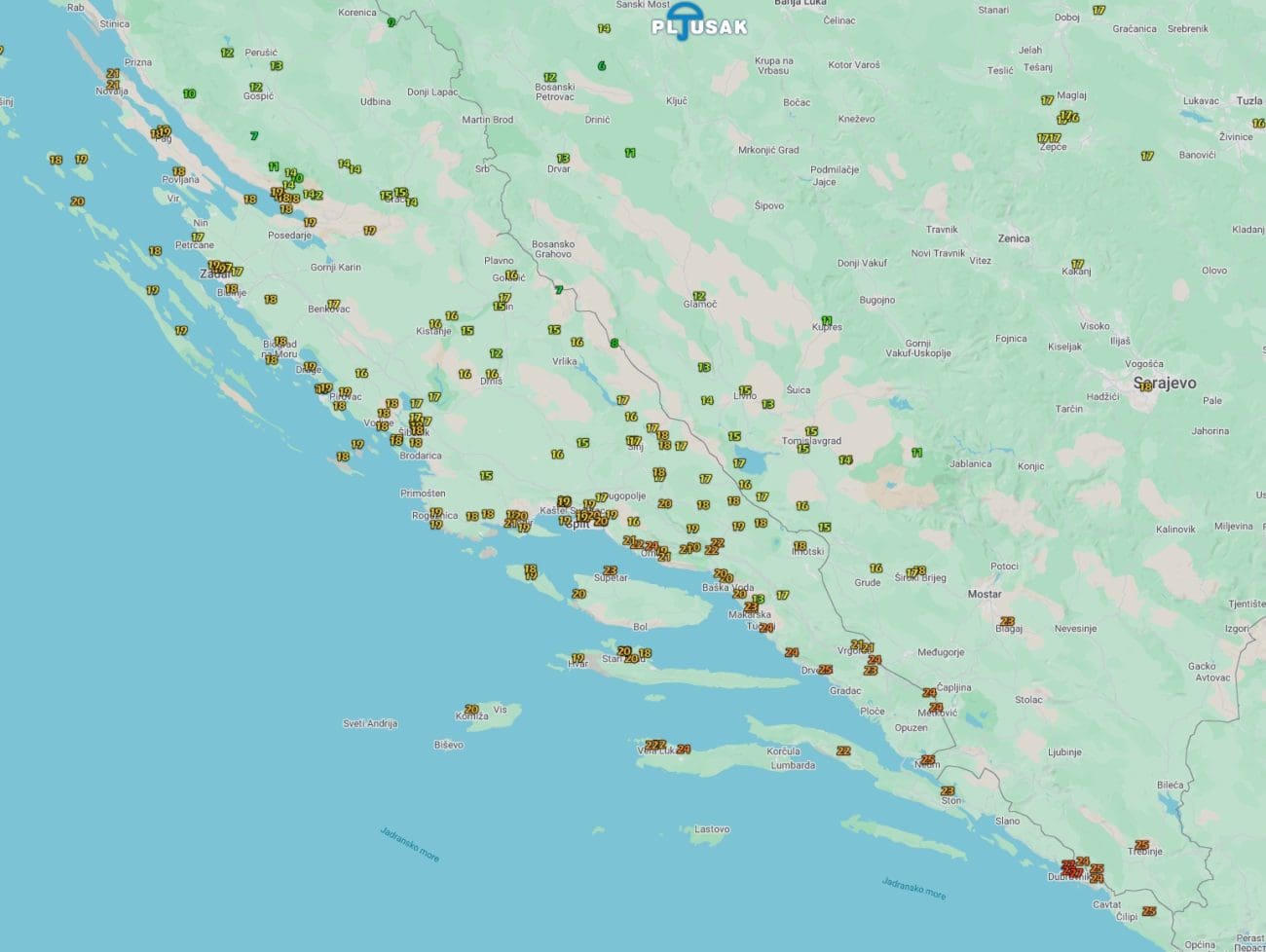 Bez obzira na mjestimične neverine, zasad nema nikakvih naznaka da se ponavlja scenarij koji je u jutarnjim satima zabilježen u Splitu i okolici. Temperature u ponoć su od samo 15°C na kninskom području do vrlo toplih 27°C u Dubrovniku. Na Sinjalu na Dinari temperatura zraka je pala na 7 stupnjeva.