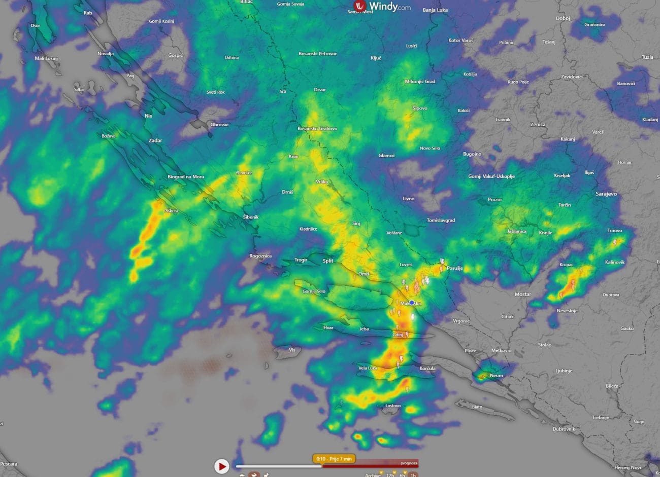 Kako se može vidjeti na radarskoj snimci oborine, oborine su zahvatile velik dio sjeverne i srednje Dalmacije, grmljavine ima od Podstrane, Omiša, istoka Brača, središnjeg Hvara, zapada Korčule i makarskog primorja. No sustav se brzo premješta u zapadnoj visinskoj struji.