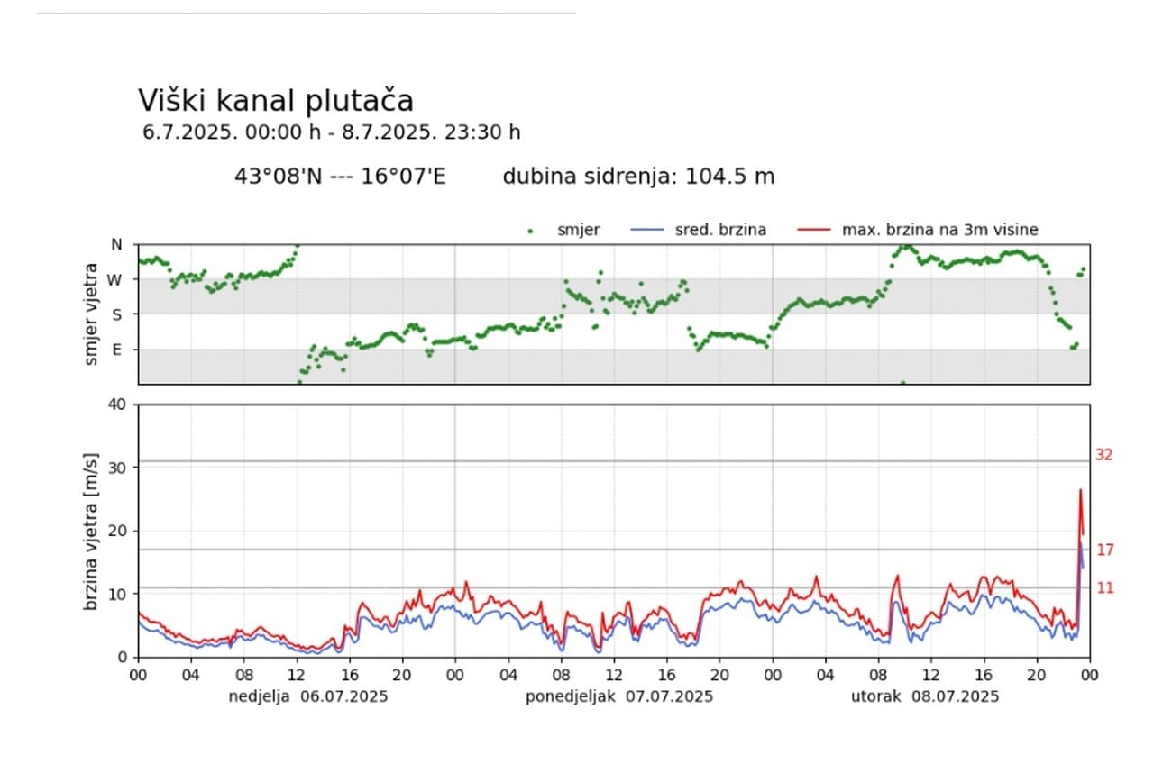 Nevrijeme je iza 23 prolazno zahvatilo područje Visa, a meteorološko-oceanografska plutača u Viškom kanalu izmjerila je udare tramontane od 28 m/s, odnosno oko 100 km/h. Srećom, ovako snažan vjetar nije potrajao.