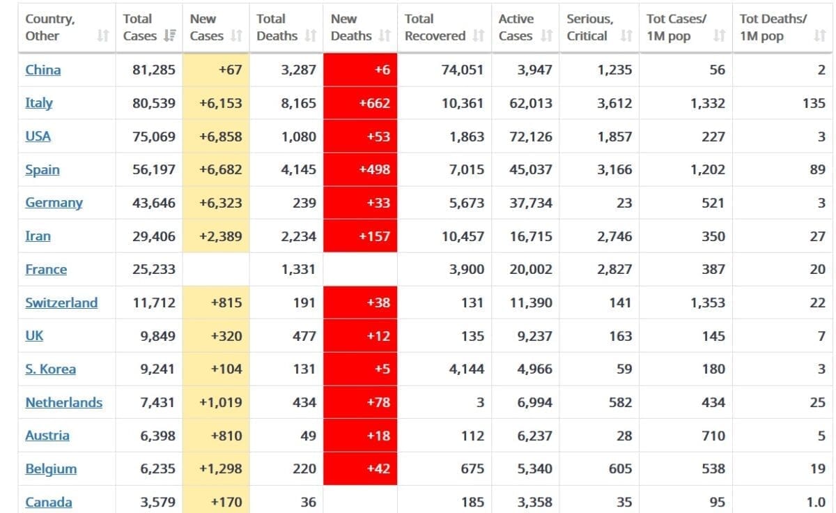 Četiri su zemlje u kojima je danas zabilježeno preko 6 tisuća novozaraženih. Uz Italiju, to su SAD (6.858), Španjolska (6.682) i Njemačka (6.323). Od navedenih zemalja najmanji broj umrlih od posljedica zaraze ima Njemačke, 33 osobe posljednja 24 sata.
