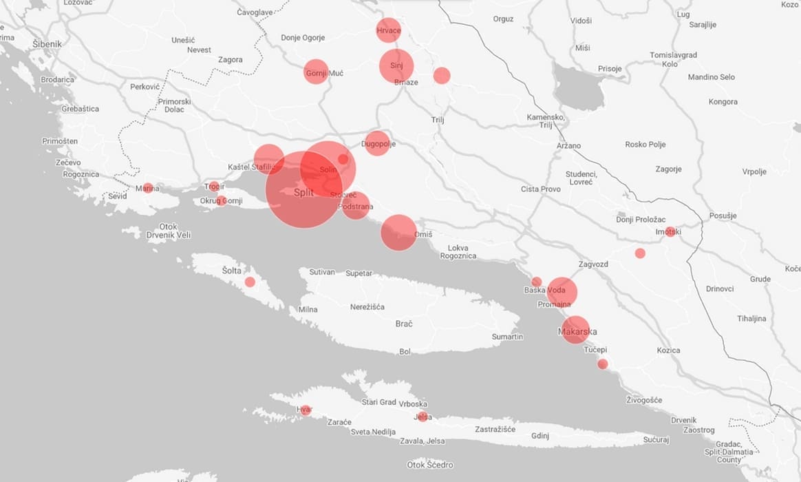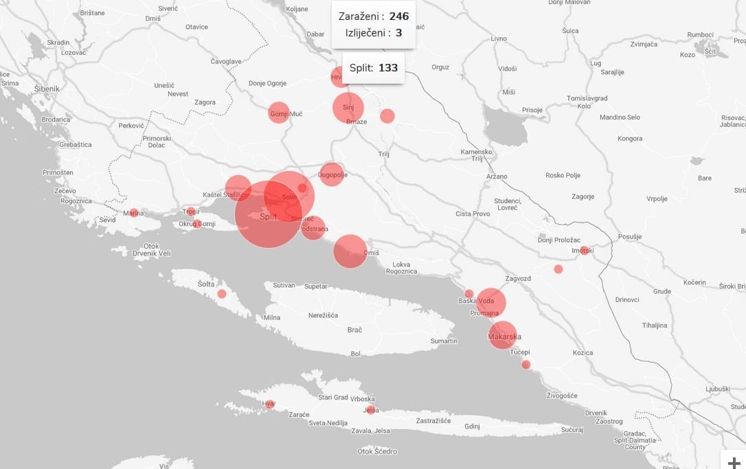 Na dan 9.4.2020. ukupno je 246 osoba zaraženo koronavirusom na području Splitsko-dalmatinske županije.
