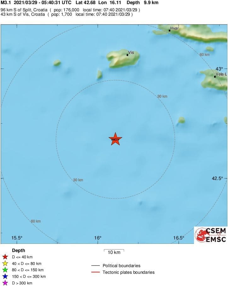 Prema podacima EMSC-a, magnituda potresa iznosila je 3.1 prema Richteru, a epicentar je bio 43 kilometra južno od Visa, odnosno 96 kilometara južno od Splita.