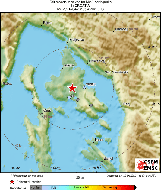 Prema podacima EMSC-a magnituda potresa iznosila je 2 stupnja prema Richterovoj ljestvici, a epicentar potresa bio je 14 kilometara južno jugo-zapadno od Crikvenice.