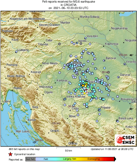 Epicentar potresa bio je 13 kilometara južno od Siska i 59 kilometara jugoistočno od Zagreba.