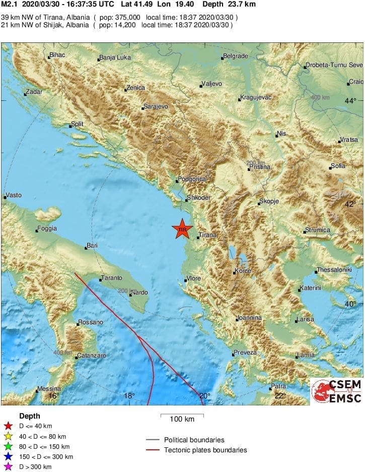 Slab potres zatresao je danas južni Jadran. Prema podacima EMSC-a u 18 sati i 37 minuta zabilježen je potres magnitude 2.1 s epicentrom u teritorijalnom moru Albanije, dvadesetak kilometara sjeverno od Drača.