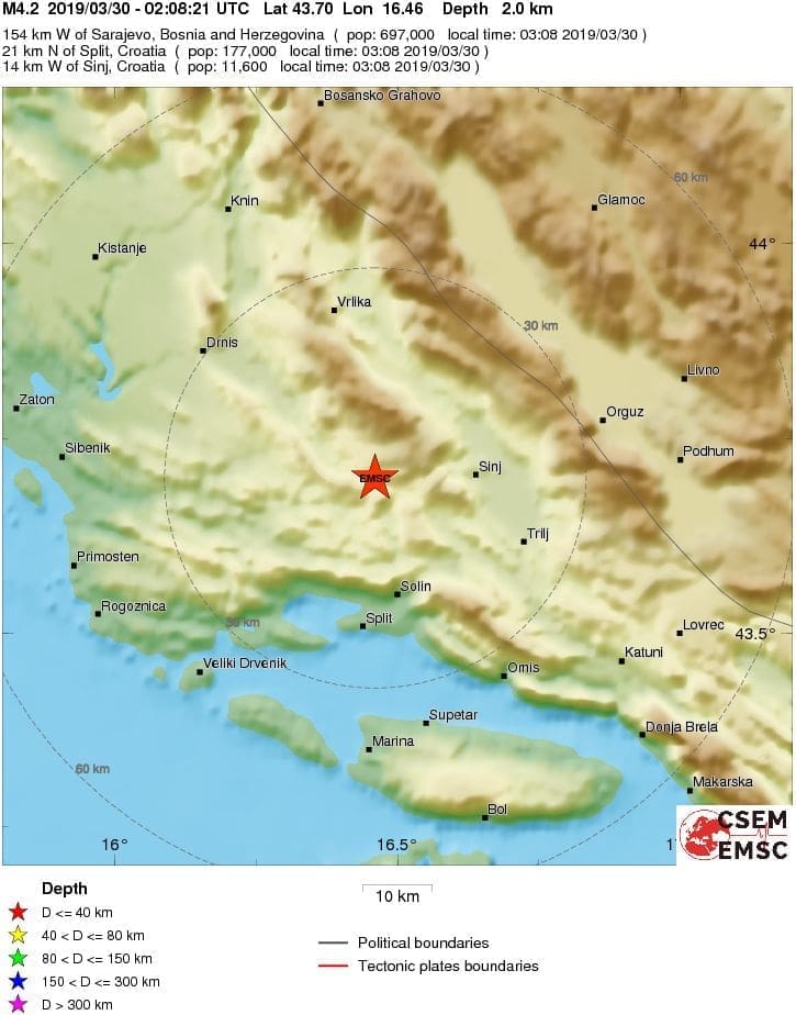 Protekle noći u 3 sata i 8 minuta seizmografi Seizmološke službe zabilježili su jak potres s epicentrom kod Donjeg Muća 16 km zapadno od Sinja. Potres je imao magnitudu M=4.0 prema Richteru. Na temelju magnitude je izračunat intenzitet u epicentru od V stupnja Mercalli-Cancani-Siebergove (MCS) ljestvice. Potres se osjetio u široj okolici Sinja - izvijestili su iz Seizmološke službe.