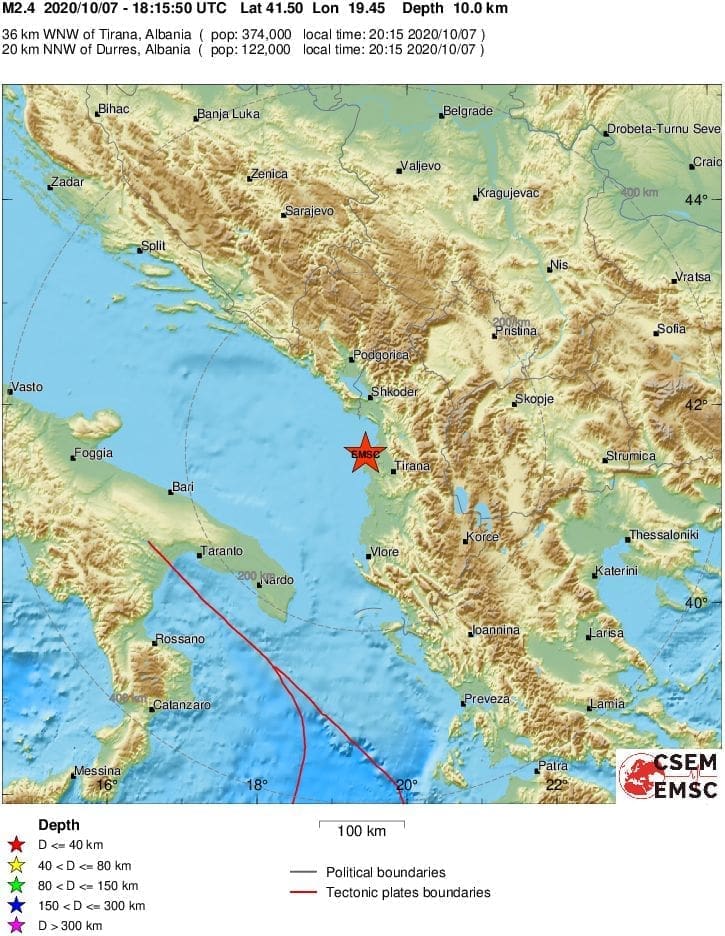 Prema podacima EMSC-a, u srijedu navečer zabilježen je potres u Jadranskom moru, u teritorijalnim vodama Albanije u 20 sati i 15 minuta.