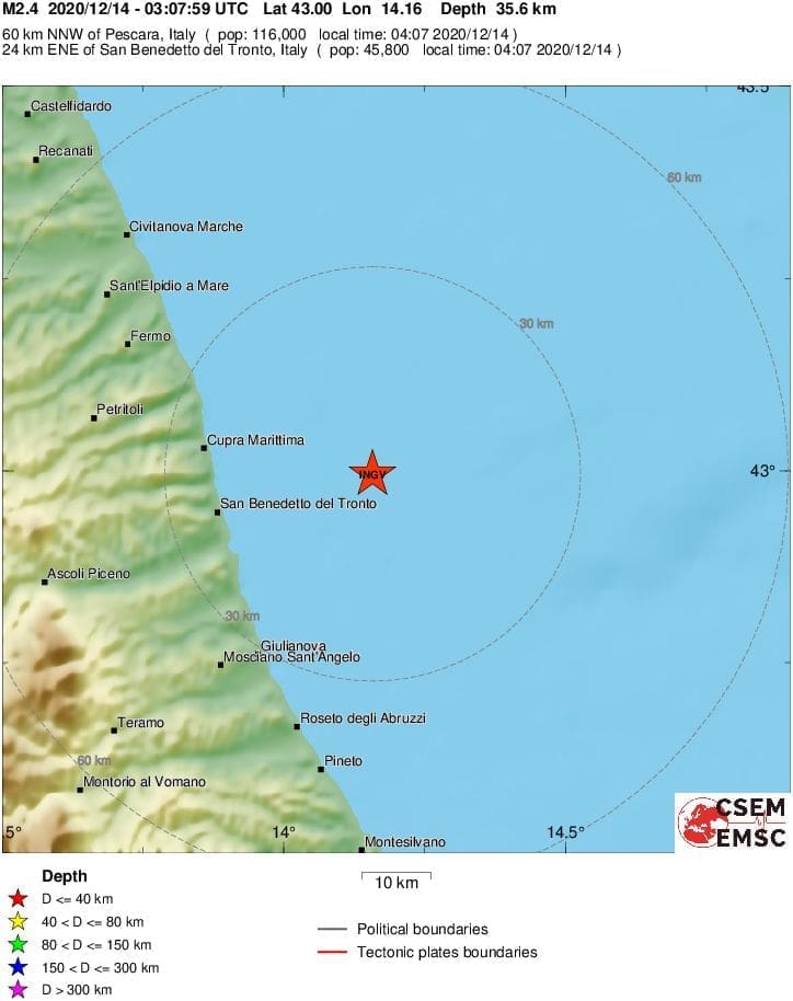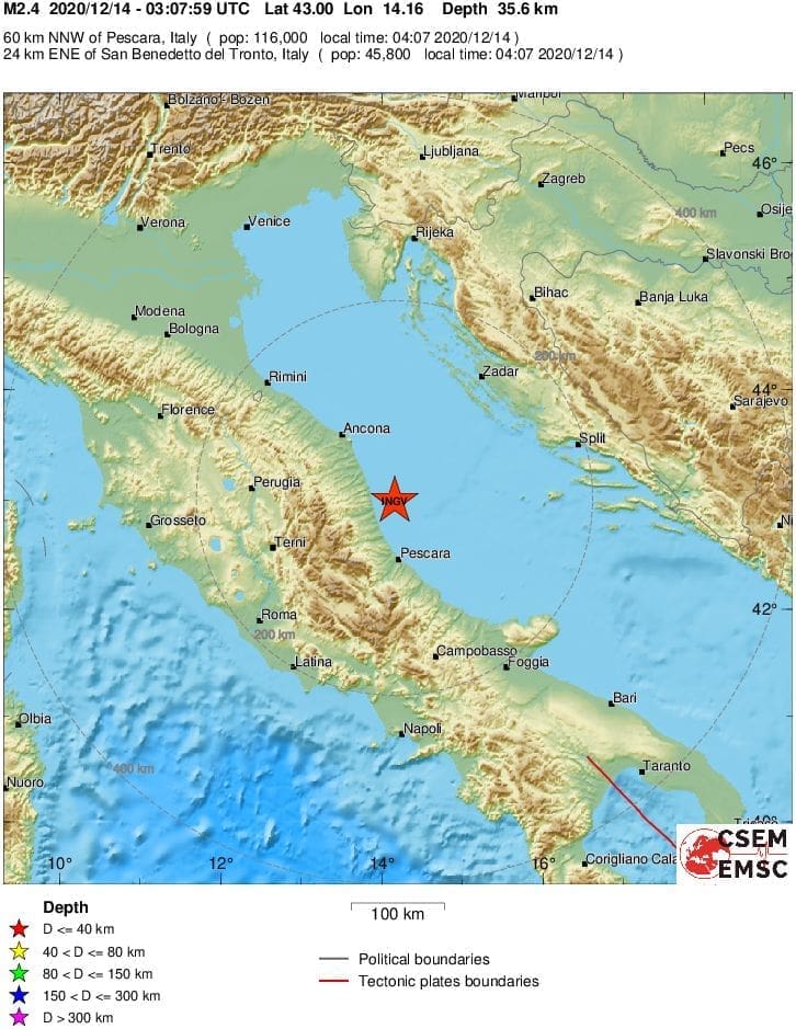 Prema podacima EMSC-a, magnituda potres bila je 2.4 prema Richteru, a epicentar u srednjem Jadranu, unutar talijanskih teritorijalnih voda, 60 kilometara istok-sjeveroistočno od Pescare.