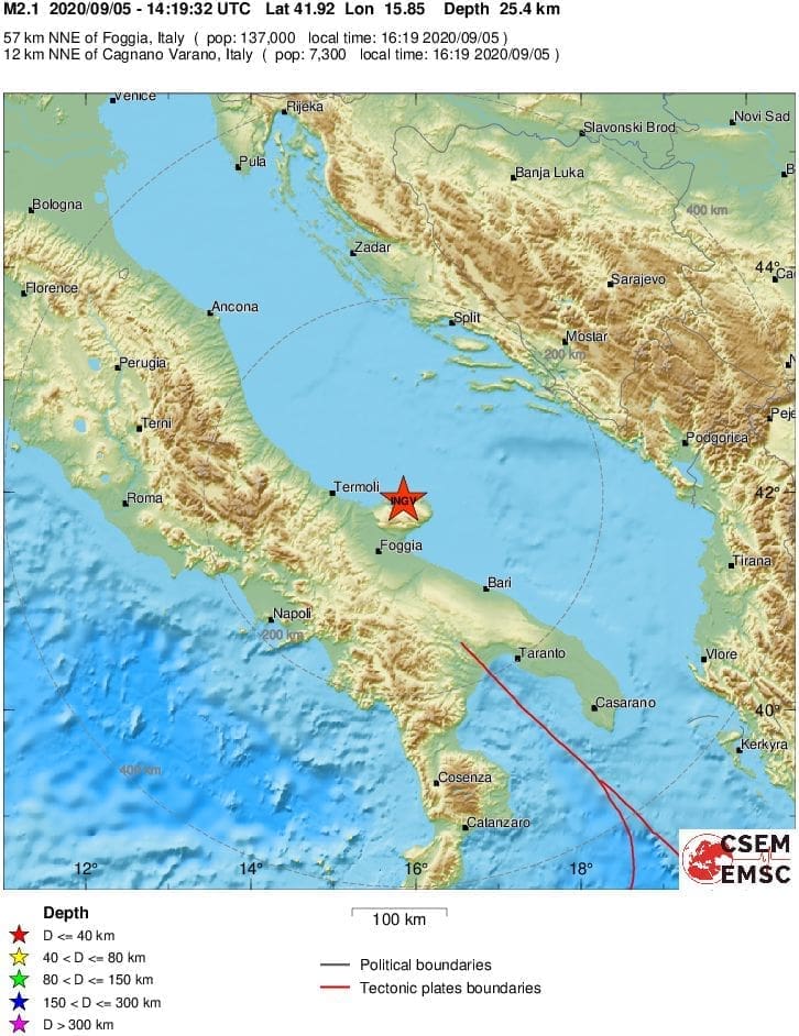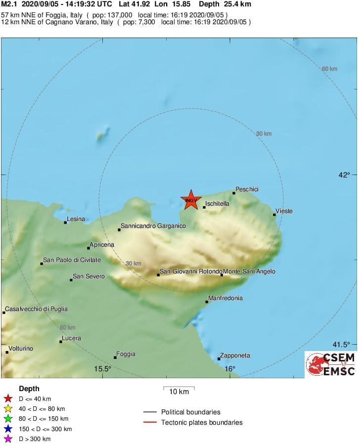 Magnituda potresa bila je 2,1 po Richteru, a epicentar 12 kilometara od Cagnano Varana te 57 kilometara sjever-sjeveroistočno od Foggiae.
