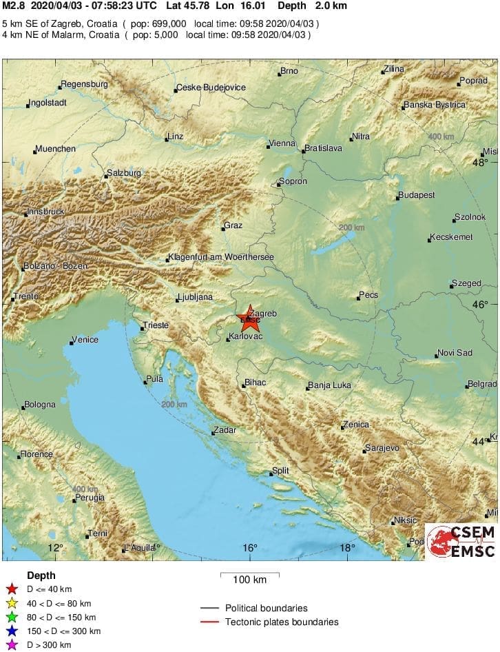 Prema podacima EMSC-a, jutros u 9 sati i 58 minuta umjeren potres zatresao je područje Zagreba.