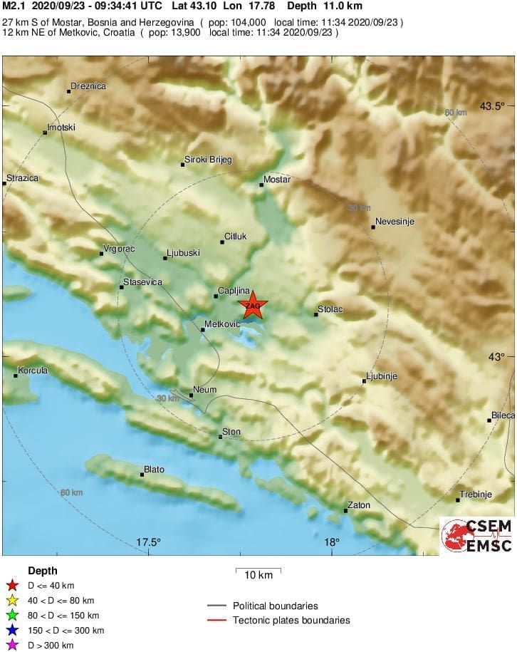 Magnituda potresa bila je 2,1 po Richteru, dogodio se na dubini od 11 kilometara. Epicentar je bio 27 kilometara južno od Mostara i svega 12 kilometara od Metkovića.