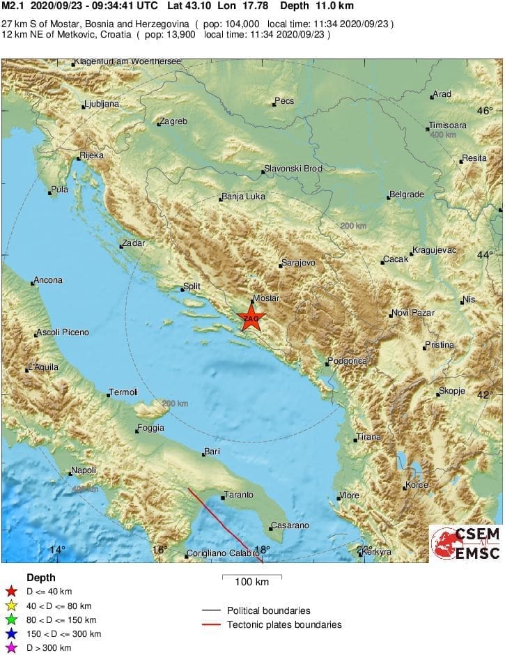 Prema podacima EMSC-a u 11 sati i 34 minute slab potres pogodio je područje južne Hercegovine.