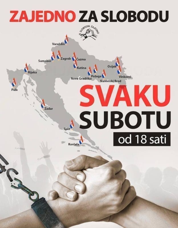 Ovu subotu tako, okupljanja će se održati u Zagrebu, Rijeci, Puli, Samoboru, Varaždinu, Vinkovcima, Osijeku, Slavonskom Brodu, Novoj Gradišci, Požegi, Čazmi, Kutini, Zadru i u gradu Korčuli, ali i u Splitu.