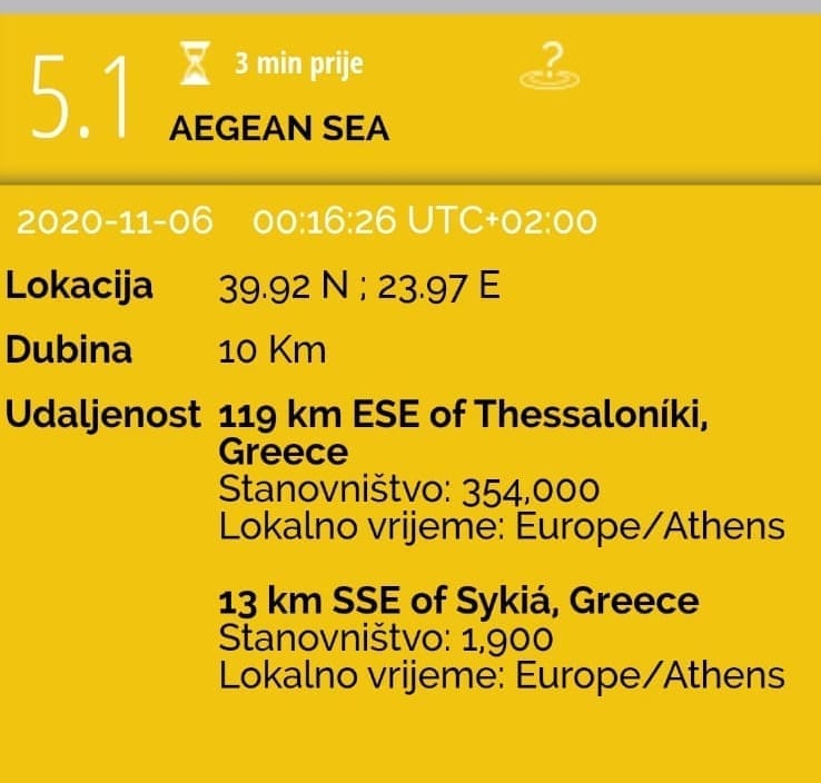 Novi jači potres pogodio je Grčku u četvrtak kasno navečer u 23 sata i 16 minuta. Prema prvim informacijama EMSC-a, potres je bio magnitude 5.1 po Richteru, a epicentar u Egejskom moru, 13 kilometara jug-jugoistočno od grad Sykia.
