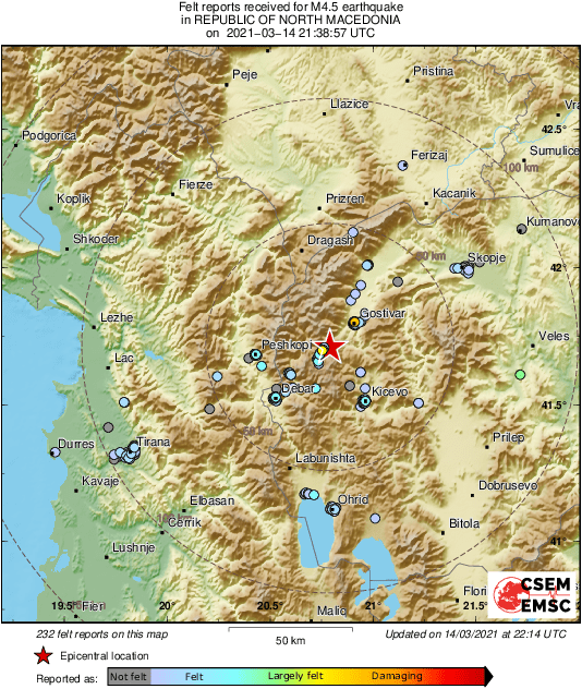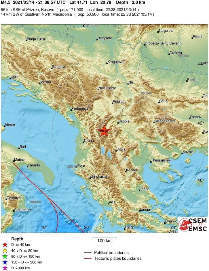 Prema podacima EMSC-a potres magnitude 4.5 prema Richeru dogodio se u 22 sata i 38 minuta, a epicentar mu je bio 57 kilometara jug-jugoistočno od Prizrena.