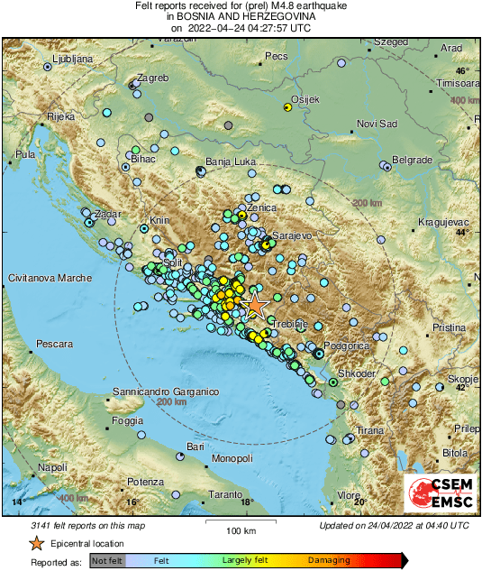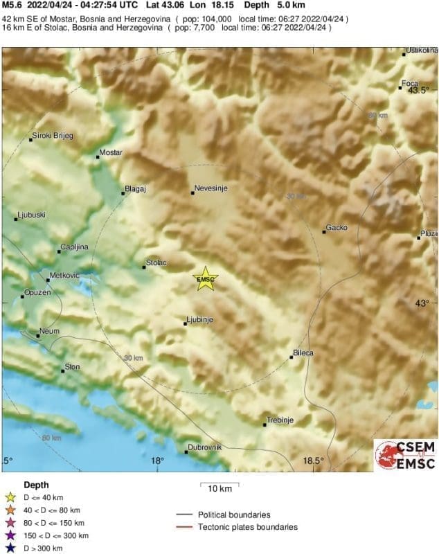 Jutros, 24. travnja 2022. godine u 06 sata i 27 minuta seizmografi Seizmološke službe zabilježili su jak potres na istom epicentralnom području nedaleko Ljubinja u BiH. Magnituda potresa iznosila je 5.0 prema Richteru, a intenzitet u epicentru V-VI stupnja EMS ljestvice