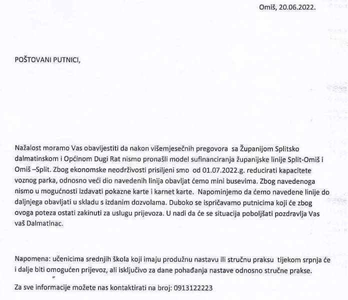 Putnici u Dugom Ratu od početka srpnja neće vidjeti velike autobuse Dalmatinac busa d.o.o., morat će zaboravit na pokazne i karnet karte i to sigurno sljedećih dva mjeseca. Iz te tvrtke sa županijskom linijskom koncesijom Omiš - Split obavijestitli su kako nakon višemjesečnih pregovora sa Splitsko - dalmatinskom županijom i općinom Dugi Rat nije pronađen model sufinanciranja te da će reducirati kapacitete voznog parka, odnosno da će voziti samo mini busevima. Učenici srednjih škola koji imaju produžnu nastavu ili stručnu praksu tijekom srpnja i dalje će biti omogućen prijevoz, ali isključivo za te dane, stoji u obavijesti putnicima.