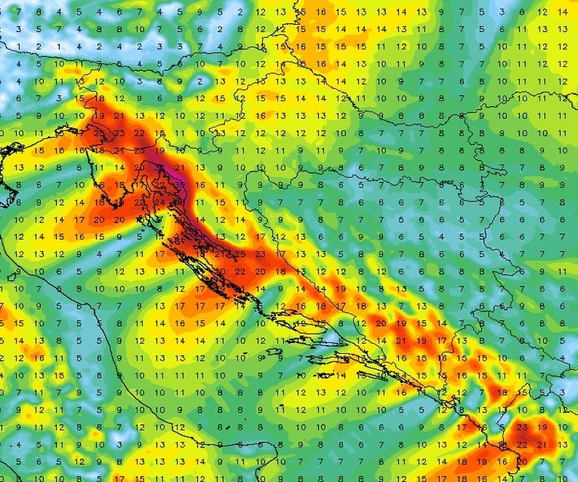 Danas nas očekuje umjereno do znatno oblačno vrijeme. Više kiše bit će na moru i otocima, a najmanje u Zagori. U nekim dijelovima Dalmacije past će tek zanemarive količine oborina. U početku će puhati umjereno, na moru i pojačano jugo, slabit će tijekom dana. Na sjevernom Jadranu će zapuhati umjerena do jaka bura, podno Velebita i olujna. Bura će se do večeri proširiti do srednje Dalmacije. Minimalne jutarnje temperature zraka od 7 do 17°C. Najviše dnevne većinom od 13 do 19°C.