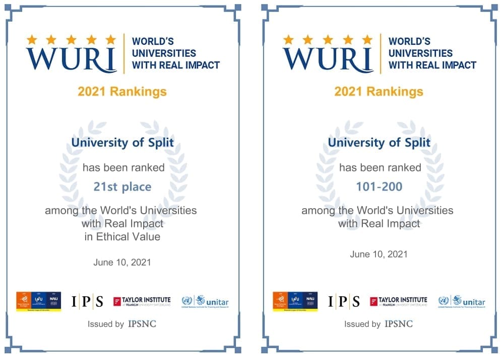 Sveučilište u Splitu, jedino iz RH, ove je godine zauzelo 21. mjesto na WURI ljestvici 2021. kao jedno od najinovativnijih sveučilišta na svijetu sa stvarnim utjecajem u kategoriji etičkih vrijednosti te 101-200 mjesto sveučilišta sa stvarnim utjecajem.