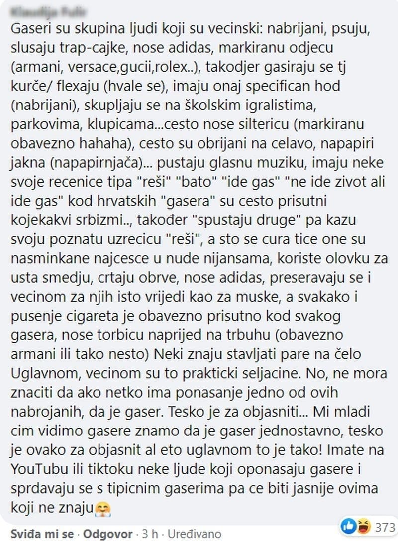 "Gaseri su ljudi koji nose markiranu odjeću i koji imaju puno novaca! (Eto ja sam već u zreloj dobi, ali čujem od mlađih)", "Zaboli me glava čitajući komentare (ne zbog komentara nego zbog toga što su ti gaseri). A migrenu dobih od onog 'ide gas' i 'reši'... Kako može toliki debilizam postati toliki popularizam? Iskreno, žao mi te djece, ali kad bi meni moji tako pričali i razmišljali pod punim gasom bi morali 'rešiti' da to izbace iz glave". "Po objašnjenjima se da zaključiti da su to papci koji misle da su frajeri", komentirali su joj neki.