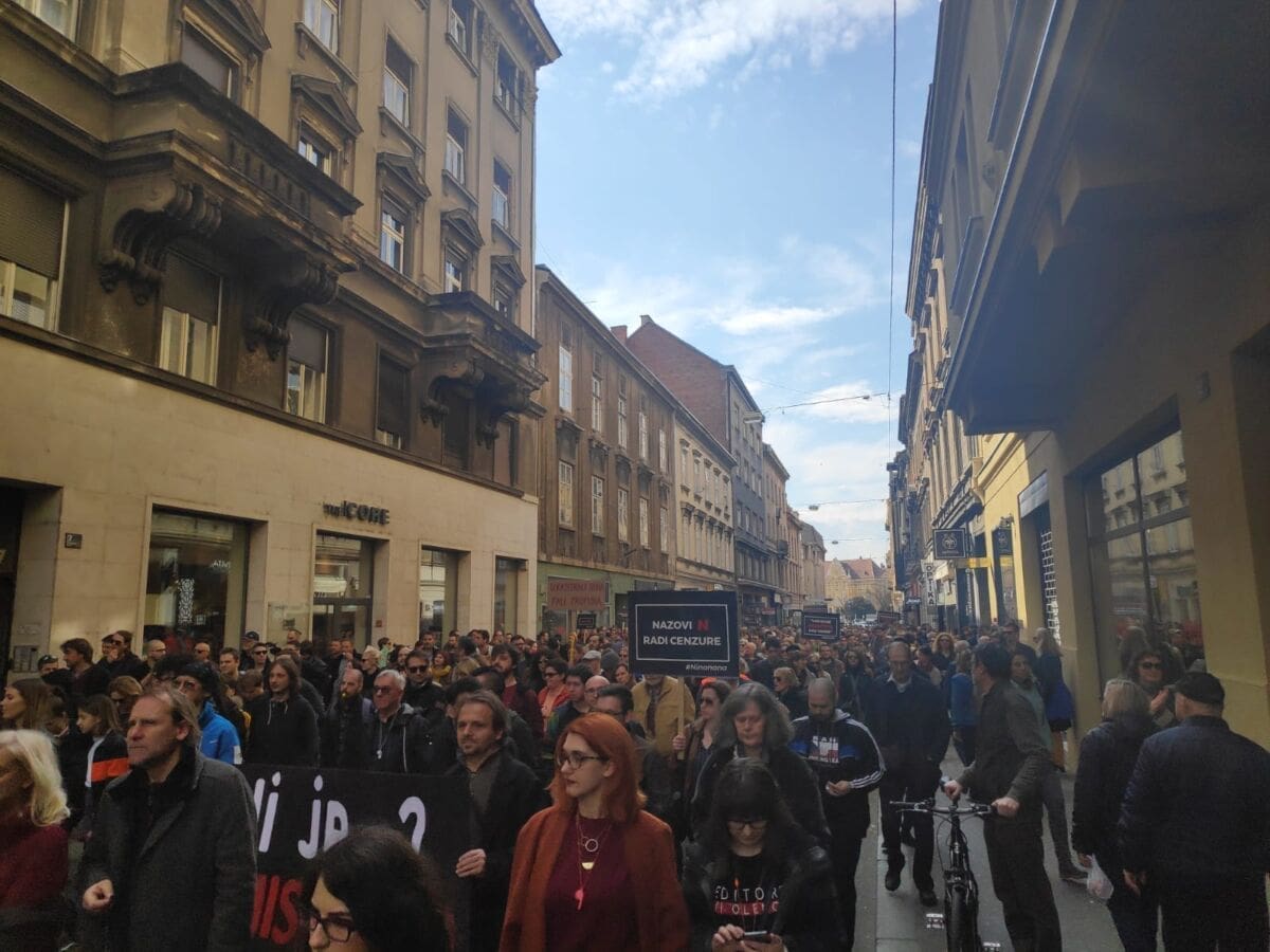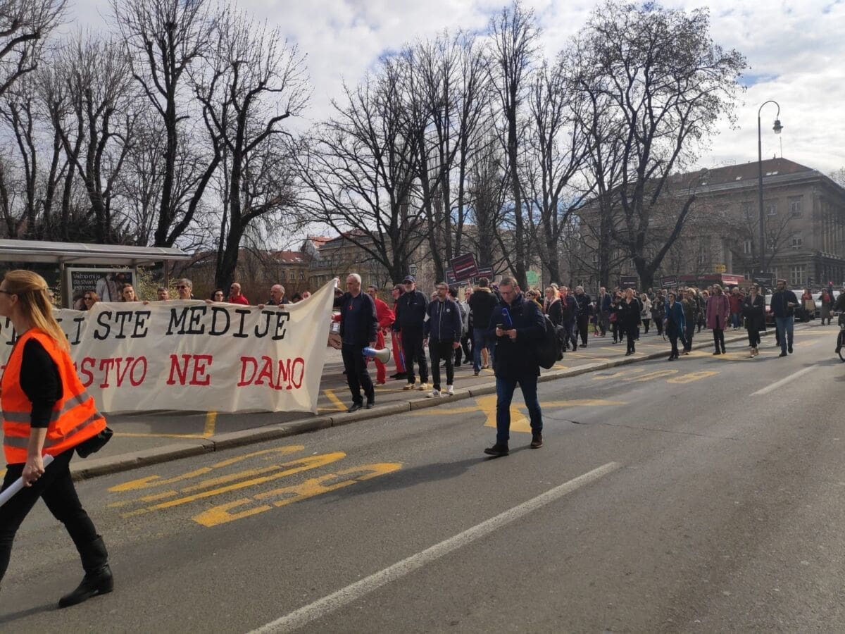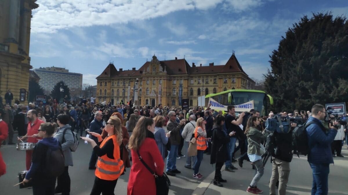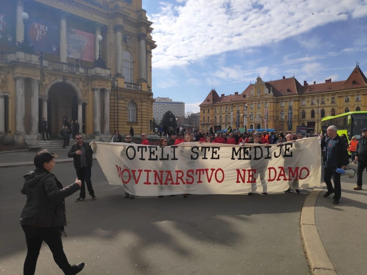 - Za ministricu je stanje na Hrvatskoj radioteleviziji i svim drugim medijima normalno, redovno, kao da ne živimo u zemlji u kojoj se novinari sudski proganjaju, prijeti im se, cenzura je svaki dan vidljiva, i tako dalje, i tako dalje. Sad ćemo ostaviti zahtjeve i krenuti prema Markovu trgu prije čega ćemo posjetiti još jednu instituciju koja se financira novcima svih vas, a to je Sveučilište u Zagrebu koje također vodi križarski rat protiv novinara i medija, na sramotu ove države i na sramotu cijele Europske unije i normalnog svijeta - dovršio je Zovko uz ovacije prosvjednika.