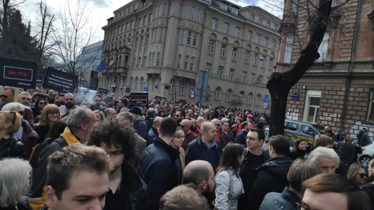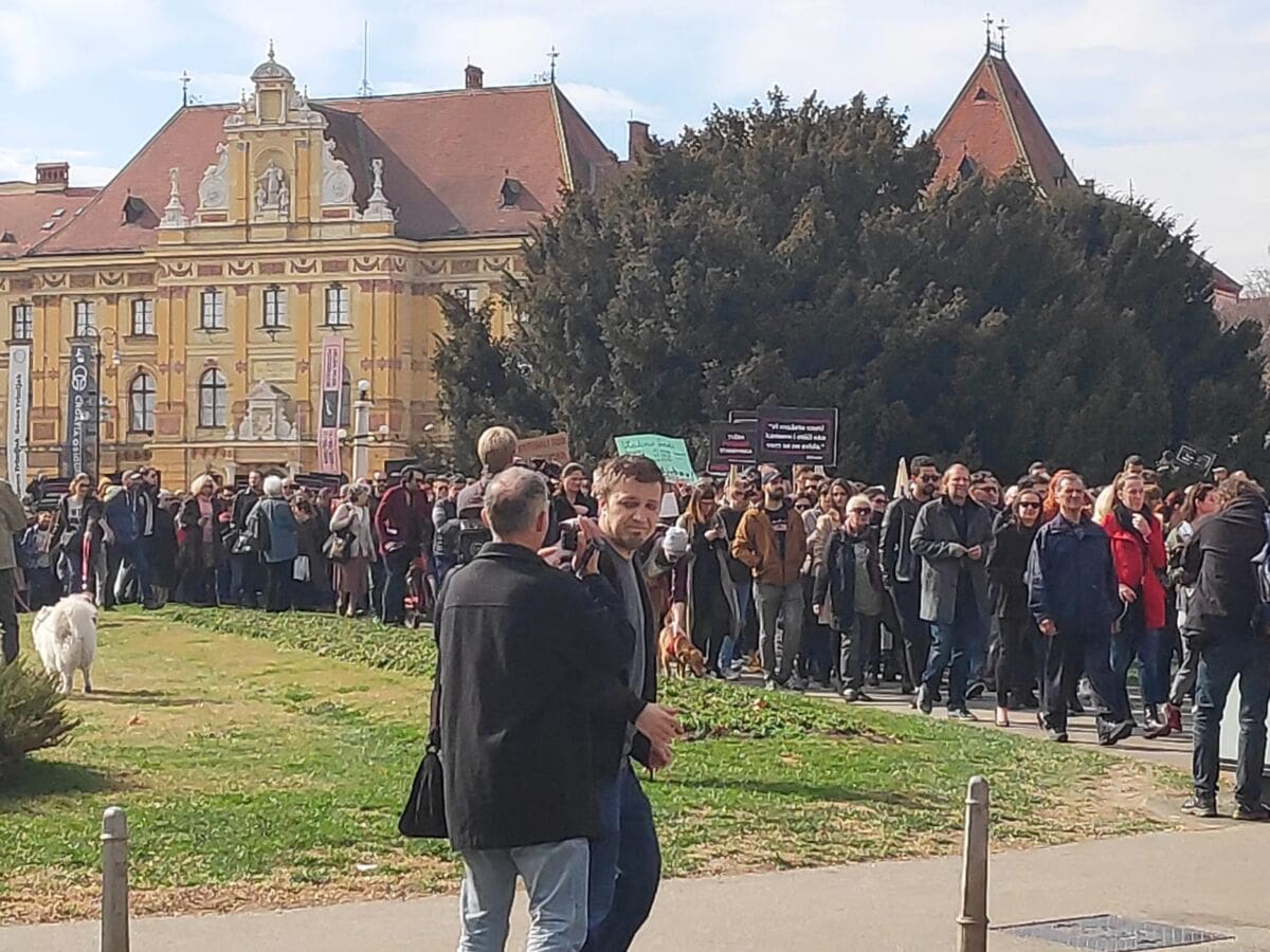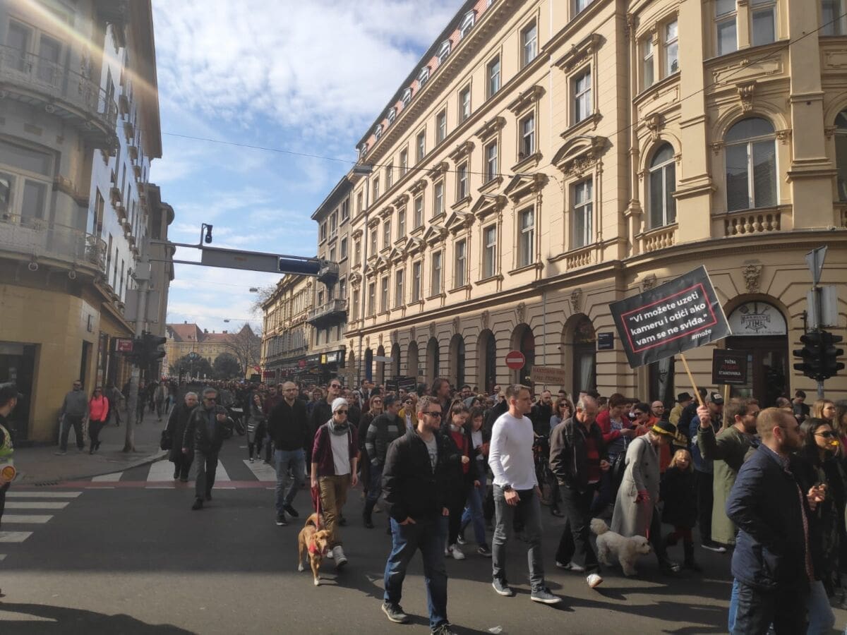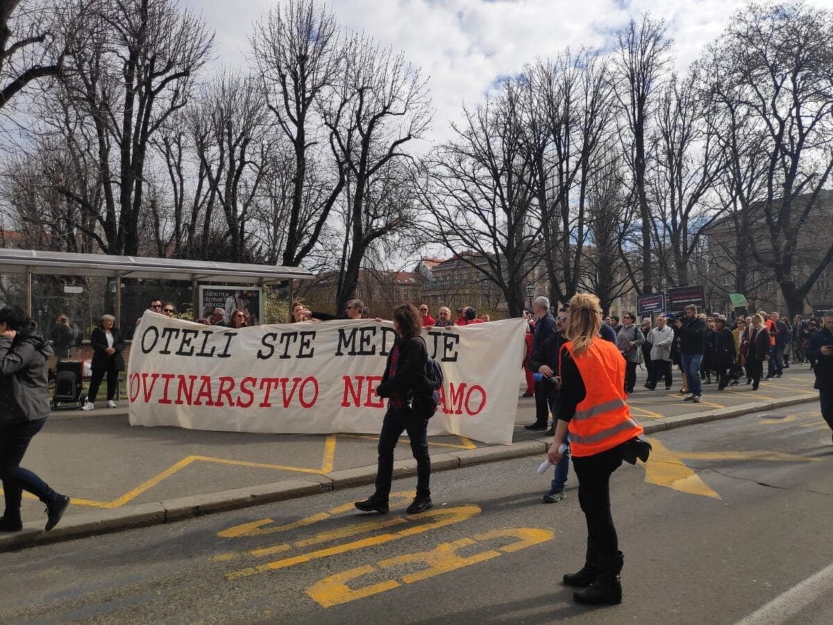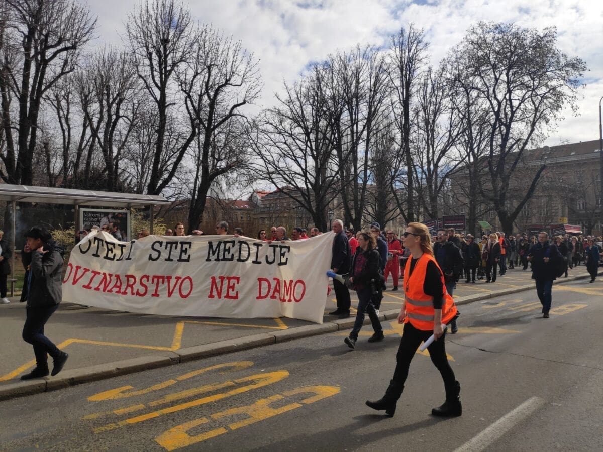 - Za ministricu je stanje na Hrvatskoj radioteleviziji i svim drugim medijima normalno, redovno, kao da ne živimo u zemlji u kojoj se novinari sudski proganjaju, prijeti im se, cenzura je svaki dan vidljiva, i tako dalje, i tako dalje. Sad ćemo ostaviti zahtjeve i krenuti prema Markovu trgu prije čega ćemo posjetiti još jednu instituciju koja se financira novcima svih vas, a to je Sveučilište u Zagrebu koje također vodi križarski rat protiv novinara i medija, na sramotu ove države i na sramotu cijele Europske unije i normalnog svijeta - dovršio je Zovko uz ovacije prosvjednika.