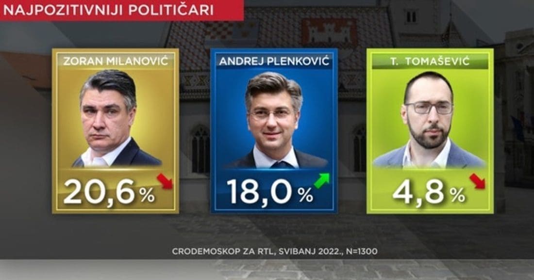 Najnegativac u državi i u svibnju je premijer Andrej Plenković - to je stav više od 28 posto ispitanika (27.7 posto u travnju). No približio mu se predsjednik Milanović kojeg od početka mandata građani nisu ovako negativno ocijenili. Stav je to gotovo četvrtine ispitanika - što je, od travnja rast od gotovo 6 postotnih bodova (svibanj 23.5 posto - travanj 17.9 posto). Komunikacijom u kojoj ne bira riječi, pa i psuje, očito mu je donijela negativne bodove.