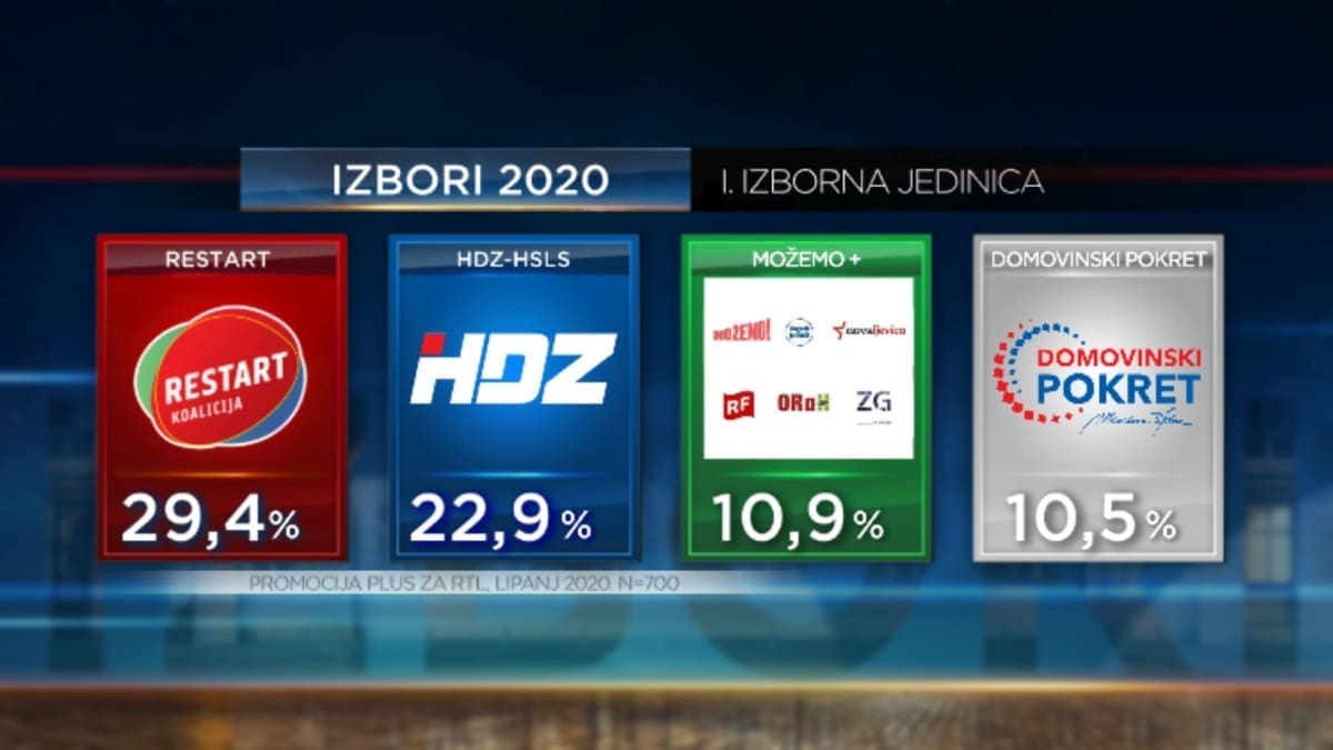 Prvi izbor u I. jedinici je Restart koalicija (29,4%), a slijedi HDZ koji je u toj izbornoj jedinici u koaliciji s HSLS-om (22,9%). Podsjetimo, SDP-ovu je koaliciju prije četiri godine u I. izbornoj jedinici zaokružilo gotovo 40 posto birača, a HDZ-ovu više od 30 posto.