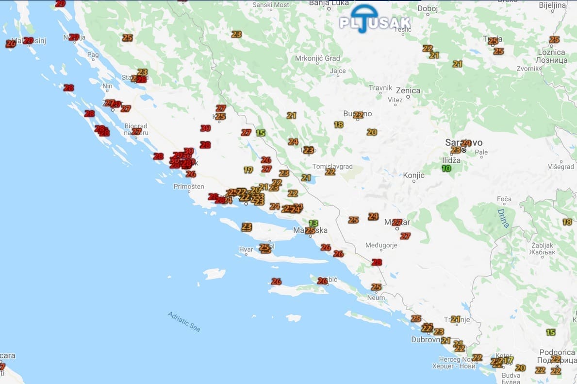 Temperatura zraka jako ovisi o pojavi kiše. Na sunčanim područjima, poput šibenskog, temperature su gotovo dosegle 30°C. U kišnom Splitu i Dubrovniku u 17 sati izmjerena su samo 22 Celzijeva stupnja.