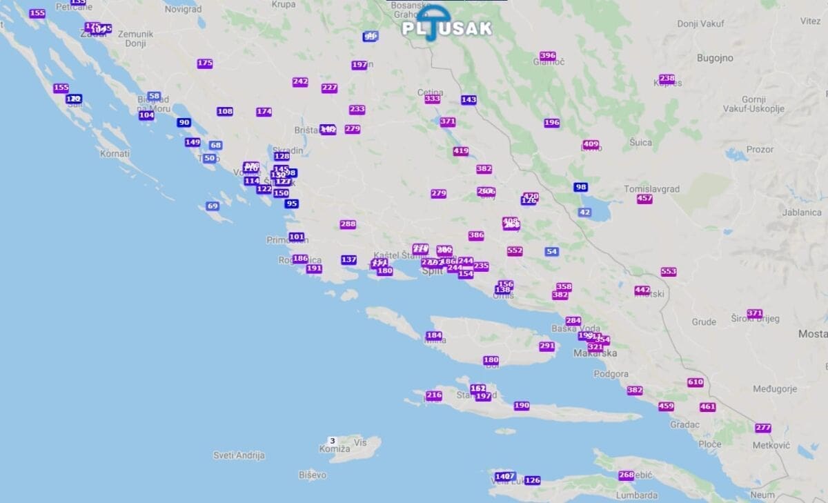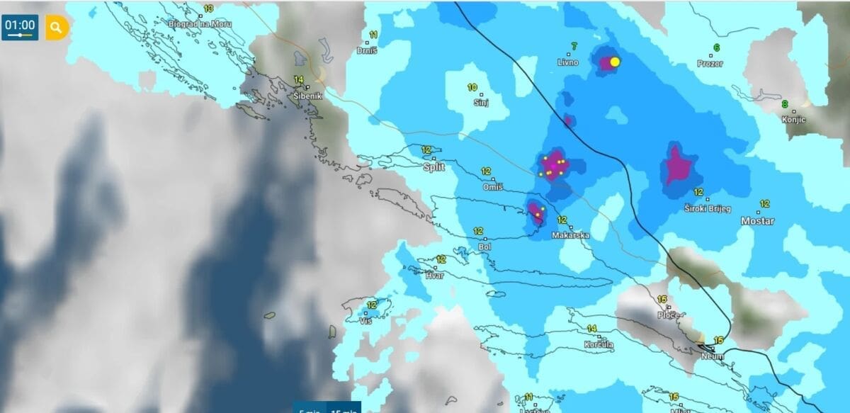 Na Jadranu puše jugo, a temperature zraka su izrazito visoke za noć na kraju prosinca. Na makarskom primorju prelaze 15 stupnjeva, a kiša trenutno pada čak i na samom vrhu Biokova.