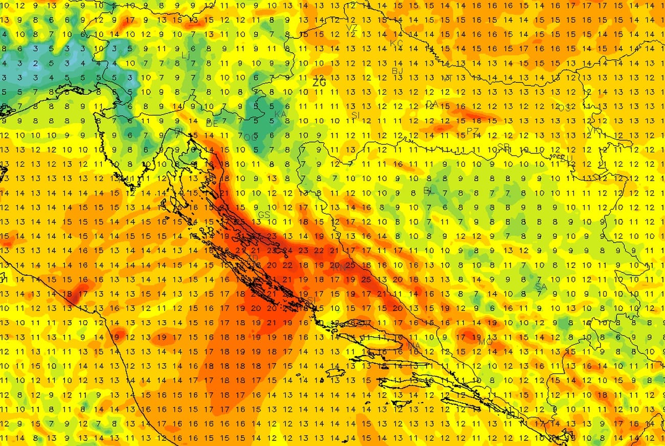 Sredinom noći novo naoblačenje s kišom, pljuskovima i grmljavinom prvo će zahvatiti sjevernu Dalmaciji, a tijekom noći proširit će se na ostatak. Lokalno je moguće jače grmljavinsko nevrijeme, ali prognostički modeli ne upućuju na ponavljanje jutrošnjeg scenarija u Splitu.