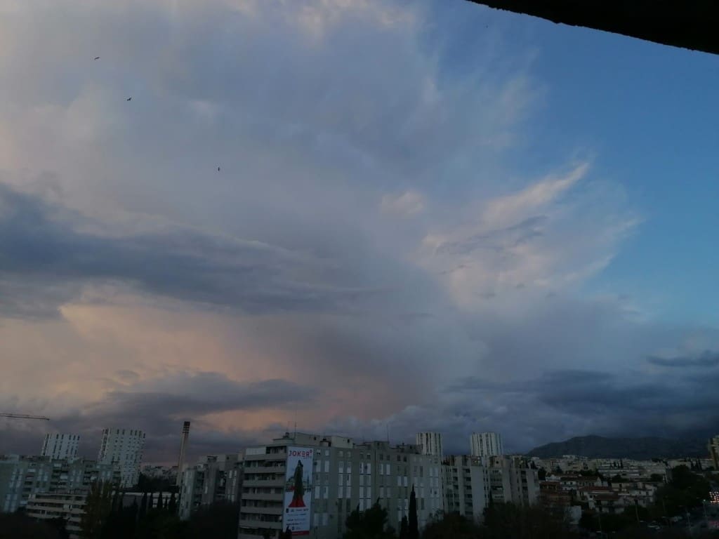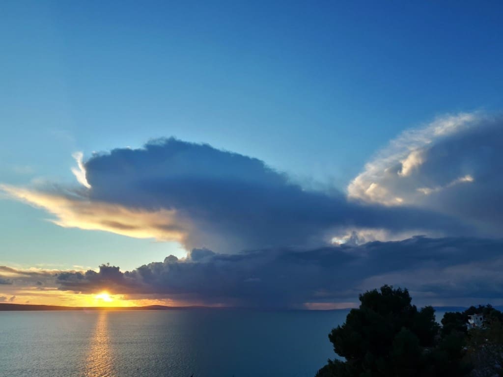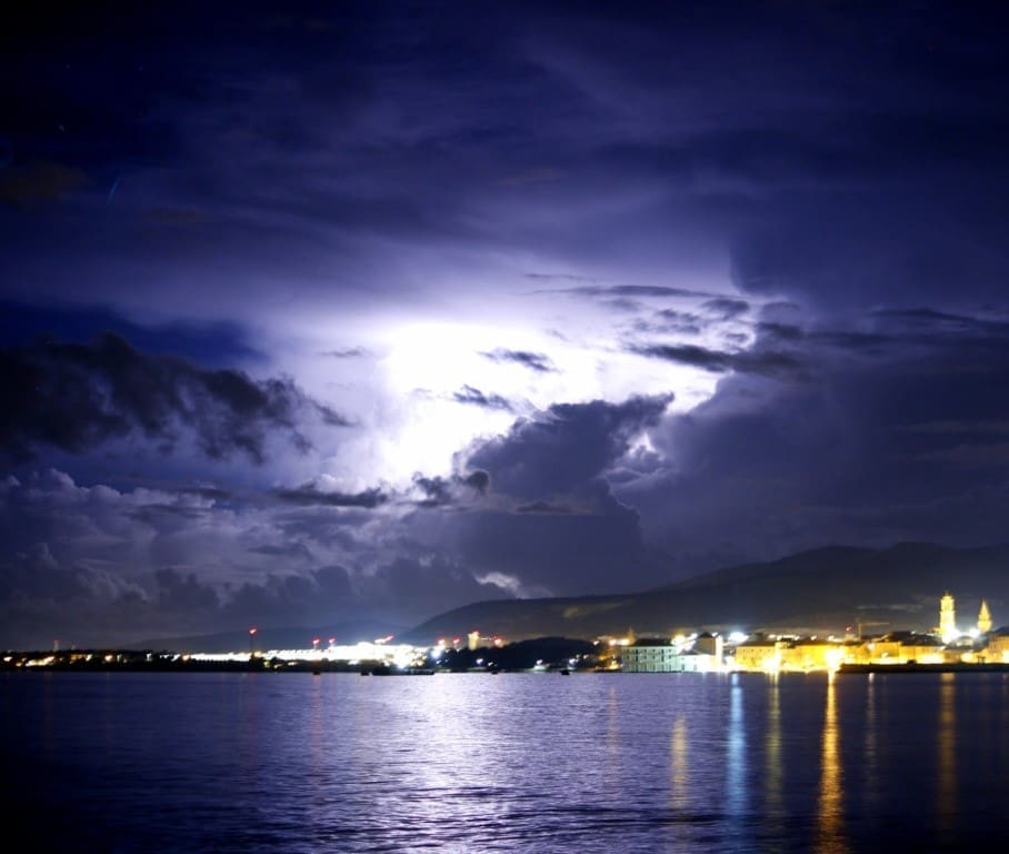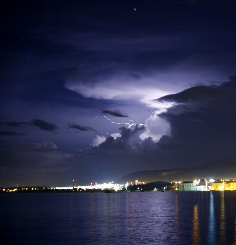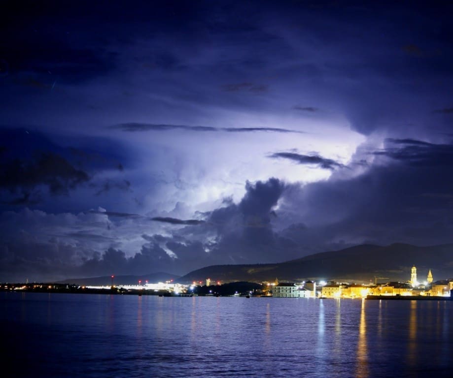 Novi sustav grmljavinskih oblaka razvio se nad morem srednje Dalmacije u četvrtak navečer. Olujni oblak primakao se rogozničkom području s mora, intenzivno sijevanje vidjelo se od Šibenika do Splita. Kako nam javljaju čitatelji, munja je udarila u jedan dalekovod u zaleđu Trogira.