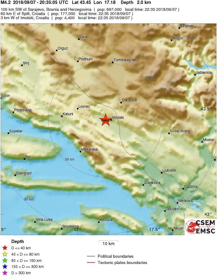 Kako pokazuju preliminarni podatci EMSC-a, potres je bio jakosti 4,3 po Richteru, a epicentar je bio na dubini od svega 2 kilometra, oko 3 kilometra zapadno od Imotskog. U međuvremenu je jakost potresa korigirana na 4,2 po Richteru.