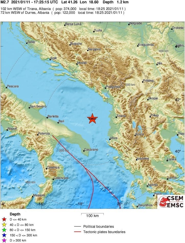 Prema podacima EMSC-a, potres magnitude 2.7 prema Richteru dogodio se u 18 i 25 minuta u albanskim teritorijalnim vodama. Epicentar mu je bio u moru, 72 kilometra zapad-jugozapadno od Drača.