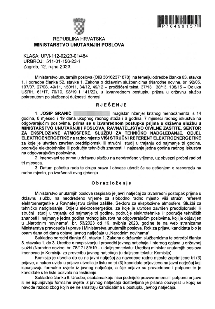 Odlukom komisije, zbog najviše bodova nakon testiranja i intervjua, izabran je savjetnik Josip Granić. Žalbeni rok istječe ovih dana. Granić ima preko 14 godina staža i preko 6 godina na odgovarajućim poslovima, piše u MUP-ovom rješenju.