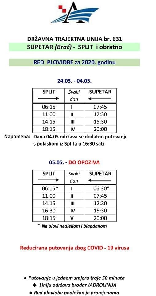 Temeljem članka 55. Zakona o prijevozu u linijskom i povremenom obalnom pomorskom prometu (NN 33/06, 38/09, 87/09,18/11, 80/13, 56/16 i 121/19) Agencija za obalni linijski pomorski promet izdaje SUGLASNOST za izmjenu reda plovidbe u državnoj trajektnoj liniji 631 Supetar - Split i obratno na način da će se umjesto 4 polazno - povratna putovanja dnevno održavati 5 polazno - povratnih putovanja dnevno.