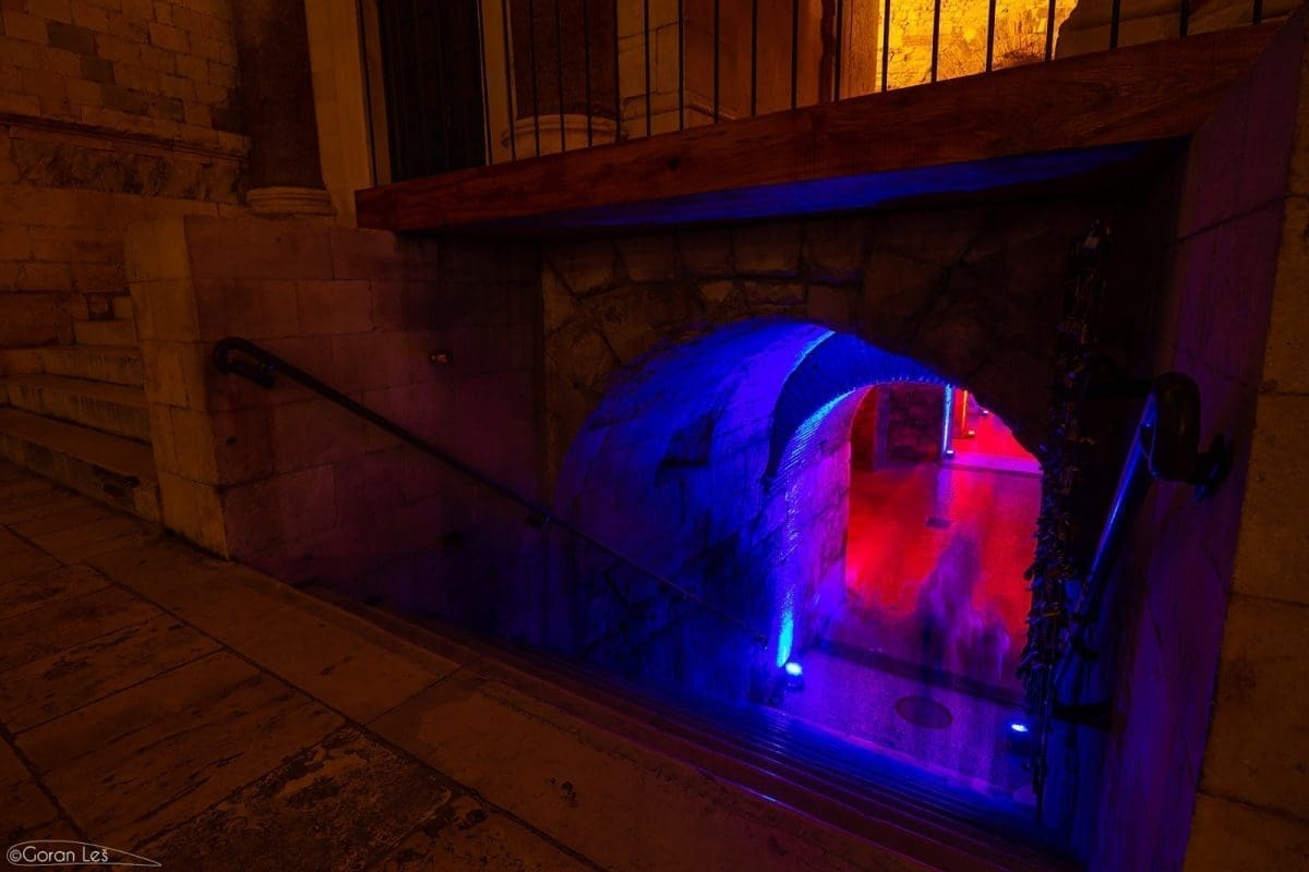 Dioklecijanovi podrumi već neko vrijeme nemaju prodajne štandove, no uoči dana Splita, blagdana svetog Dujma, zasjali su novim sjajem. Naime, jedna od najvećih splitskih atrakcija osvijetljena je ambijentalnom rasvjetom, a kako je jučer igrao Hajduk, podrumi su dobili crveno-plavu verziju.