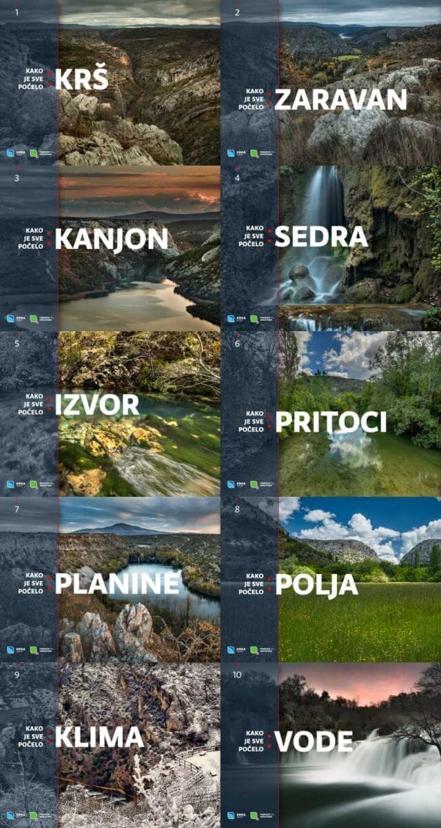 Iako se Krka i krajolik uz nju doimaju vječnima, rađanje rijeke i stvaranje krša trajalo je eonima, ostavivši nam tragove iz kojih danas iščitavamo geološku prošlost toga prostora. Kroz ciklus tekstova „Kako je sve počelo“ predstavljen je reljef rijeke Krke, nevidljivi procesi koji su pejsaže kojima se divimo učinili takvima kakvi jesu. Ono što je priroda stvarala milijunima godina, sažeto je u deset tjedana, kako bismo otkrili tajne krša, glavnog počela. U drugom ciklusu koji slijedi pokušat ćemo vam prenijeti sve što znamo o temeljnom fenomenu Nacionalnog parka „Krka“ – sedri.