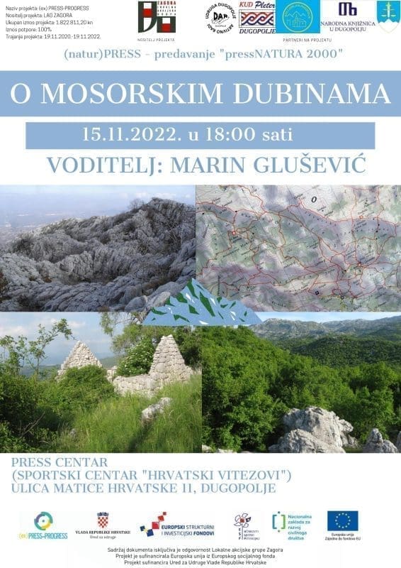 Lokalna akcijska grupa Zagora s projektnim partnerima poziva sve zainteresirane na još jedno u nizu „pressNATURA 2000“ predavanja naziva “O mosorskim dubinama” u okviru projekta (ex)PRESS-PROGRESS koje će se održati 15. studenoga 2022. u 18:00 sati u PRESS centru ŠC “Hrvatski vitezovi”. Predavanje će održati jedan od najboljih dalmatinskih speleologa, Marin Glušević, instruktor speleologije Hrvatskog planinarskog saveza i dugogodišnji član speleološkog odjela Hrvatskog planinarskog društva "Mosor" iz Splita.