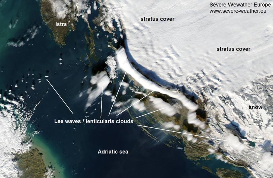 Ciklona na odlasku donijela je postupno smirivanje vremena, još jedan dan s burom, ali i na dijelu Jadrana i zanimljive formacije oblaka. Pri tome su najzanimljiviji bili lentikularisi (altocumulus lenticularis) koji su preplavili nebo nad zaleđem Kvarnera.