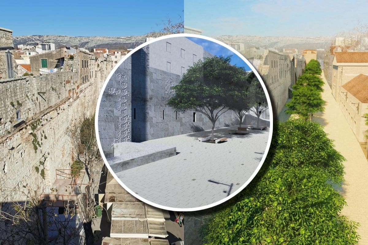 "Bila je ideja da svu javnu urbanu opremu spustimo na razinu poda. To su klupe, koševi za smeće i rasvjetna tijela. Na suprotnoj strani od zidina palače nalaze se rasvjetna tijela na fasadi, kako se trenutno nalaze, te ćemo kroz razradu projekta vidjeti može li se to. Držale smo se onoga što je već postavljeno.”